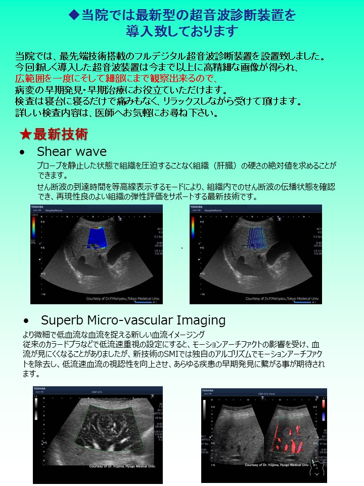 非常に高品質な画像を取ることが可能で、肝臓・膵臓・腎臓などの臓器や甲状腺、心臓などの病変をいちはやく見つけることができます。